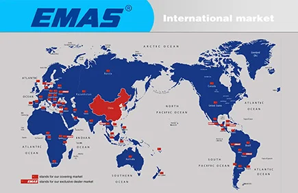 EMAS tem uma equipe de vendas forte nosso alcance internacional se expande continuamente sob a liderança da nossa CEO, vendendo produtos para a Europa, América do Sul, América do Norte, Oriente Médio e Ásia — totalizando mais de 63 países.